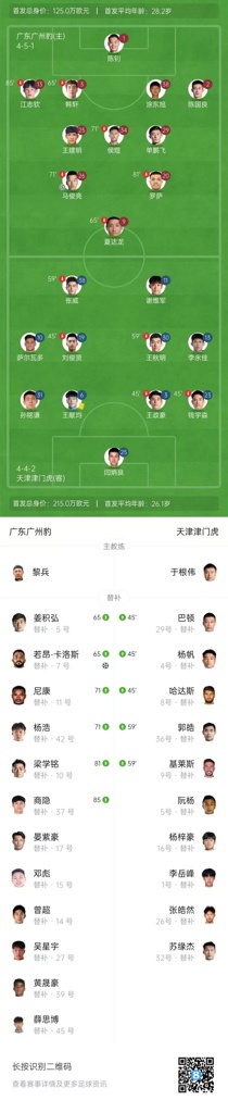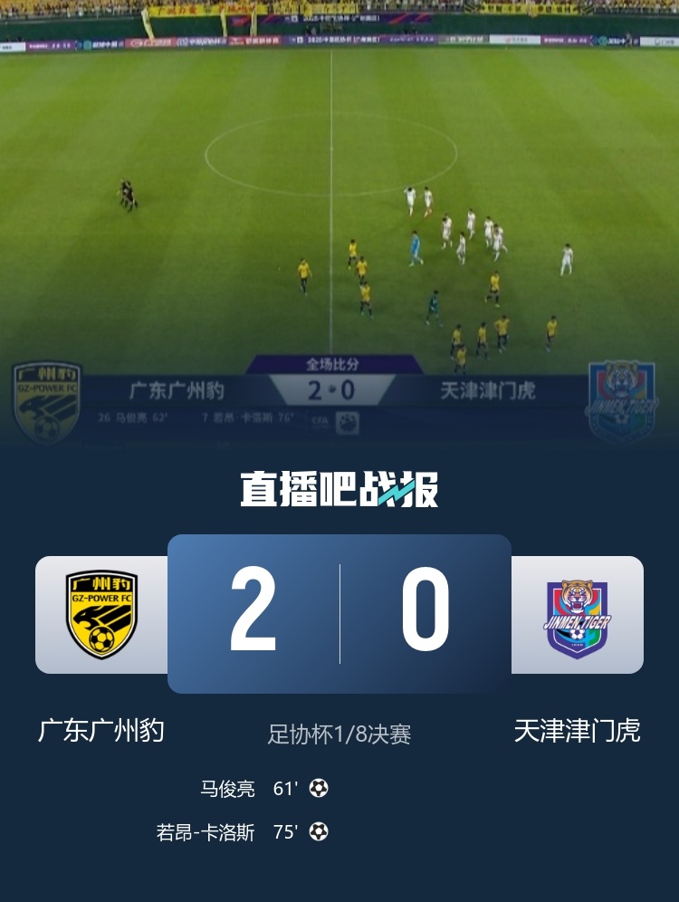 全场比赛结束,广东广州豹2-0天津津门虎。