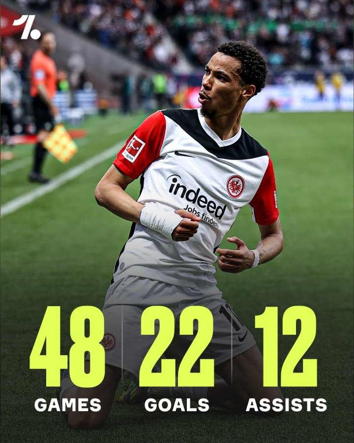 去年夏天法兰克福买断埃基蒂克,本赛季球员延续了不错的表现,出战48场,贡献22球12助攻,他的德转身价也一路涨到了7500万欧。